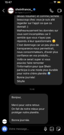 Dans tous les cas, c’est très très cool de faire cette transition, de s’intéresser à ce qui se cache derrière les produits Shein, car on ne va pas se mentir, préserver l’environnement n’est pour l’instant pas la priorité de la marque, en témoigne leur réponse à une de nos utilisatrices qui leur demandaient de participer à leur évaluation sur Clear Fashion :