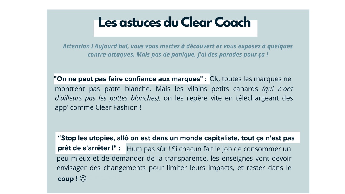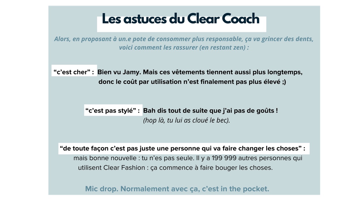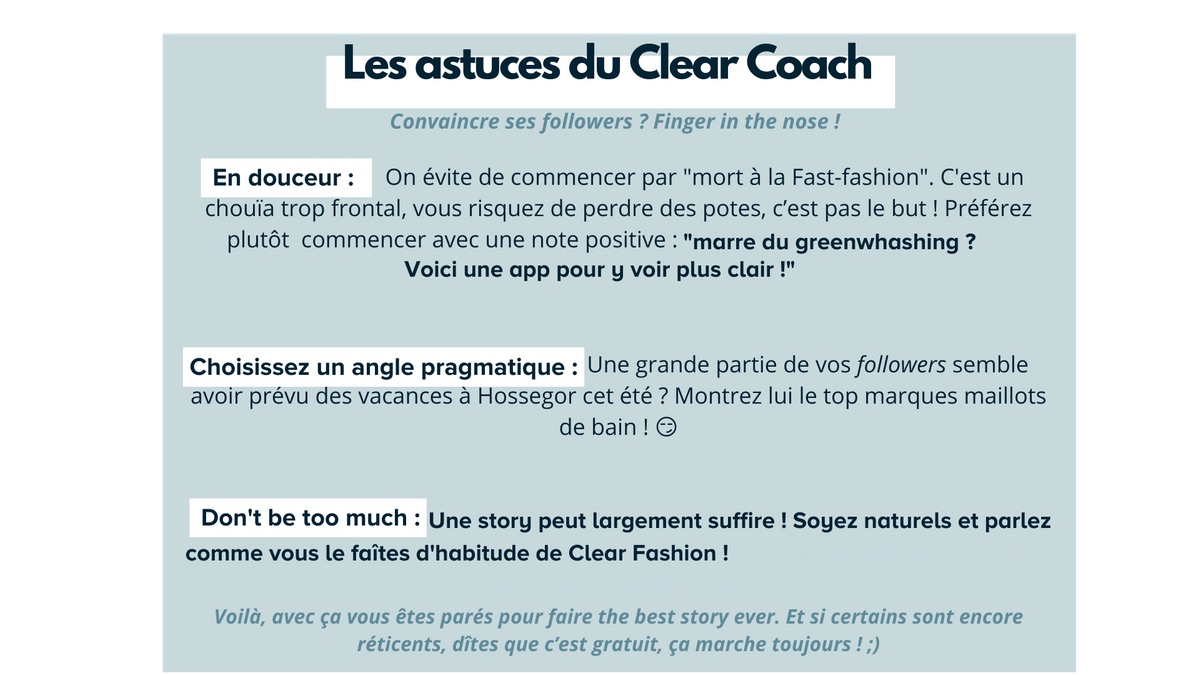 Bravo et merci d’avoir réussi à convaincre vos proches la semaine dernière ! Cependant, on pense sincèrement que l’application Clear Fashion peut être très utile pour des personnes aux profils de consommation très différents et on a besoin de vous pour le prouver ! Alors n’hésitez pas à partager l’application sur vos réseaux sociaux en créant une petite story ! 😉 Et n’oubliez pas de mentionner le compte Clear Fashion @clearfashionapp, on a hâte de voir ça ! Et pour vous aider, voici les conseils du Clear Coach :