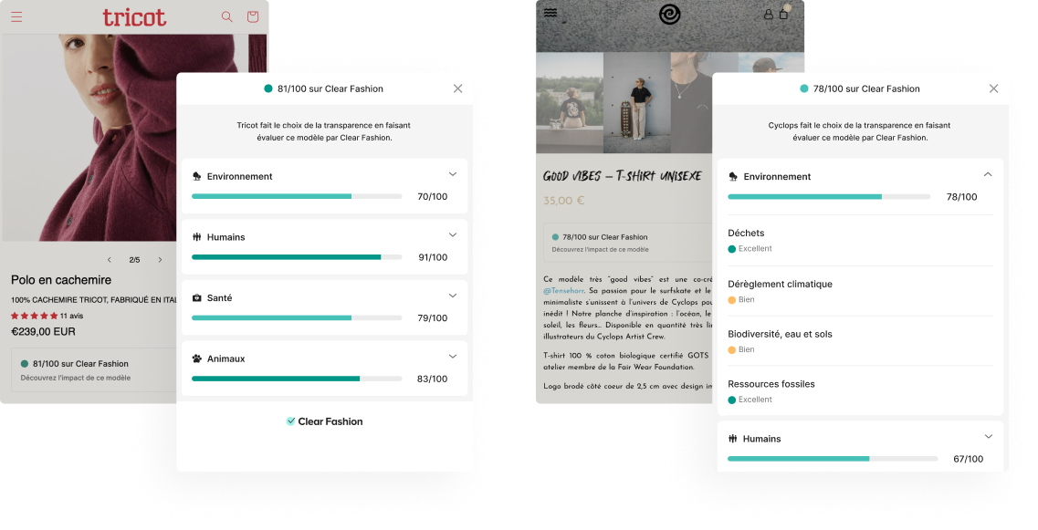 Chez Clear Fashion, nous avons développé des outils à destination des marques qui leur permettent simplement de calculer leurs scores et de les afficher aux consommateurs.